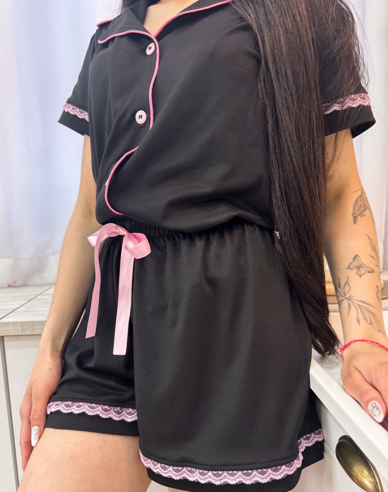 Na cor preta, o modelo ganha destaque com detalhes em rosa — a fita decorativa em cetim e a renda delicada aplicada nas mangas e na barra da bermuda, trazendo um contraste suave e cheio de feminilidade.