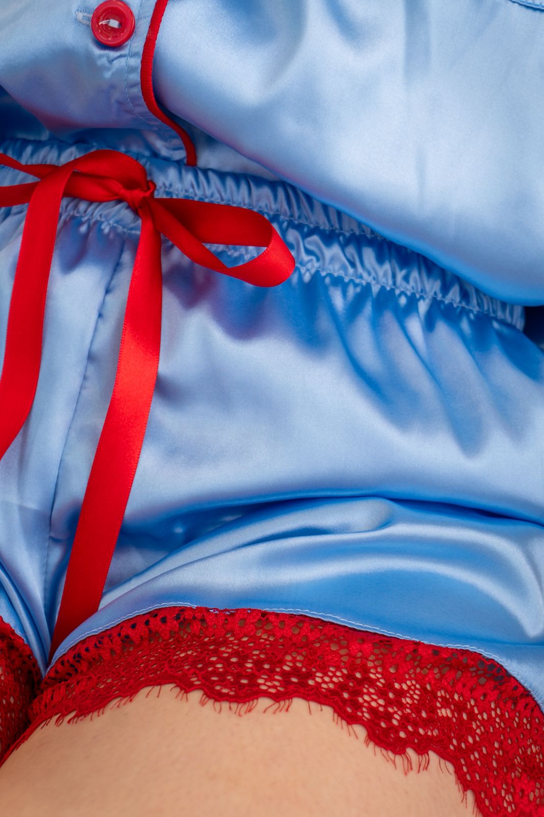 Em cetim azul bebê com detalhes em vermelho, ele é puro encanto — delicado, sofisticado e cheio de personalidade.