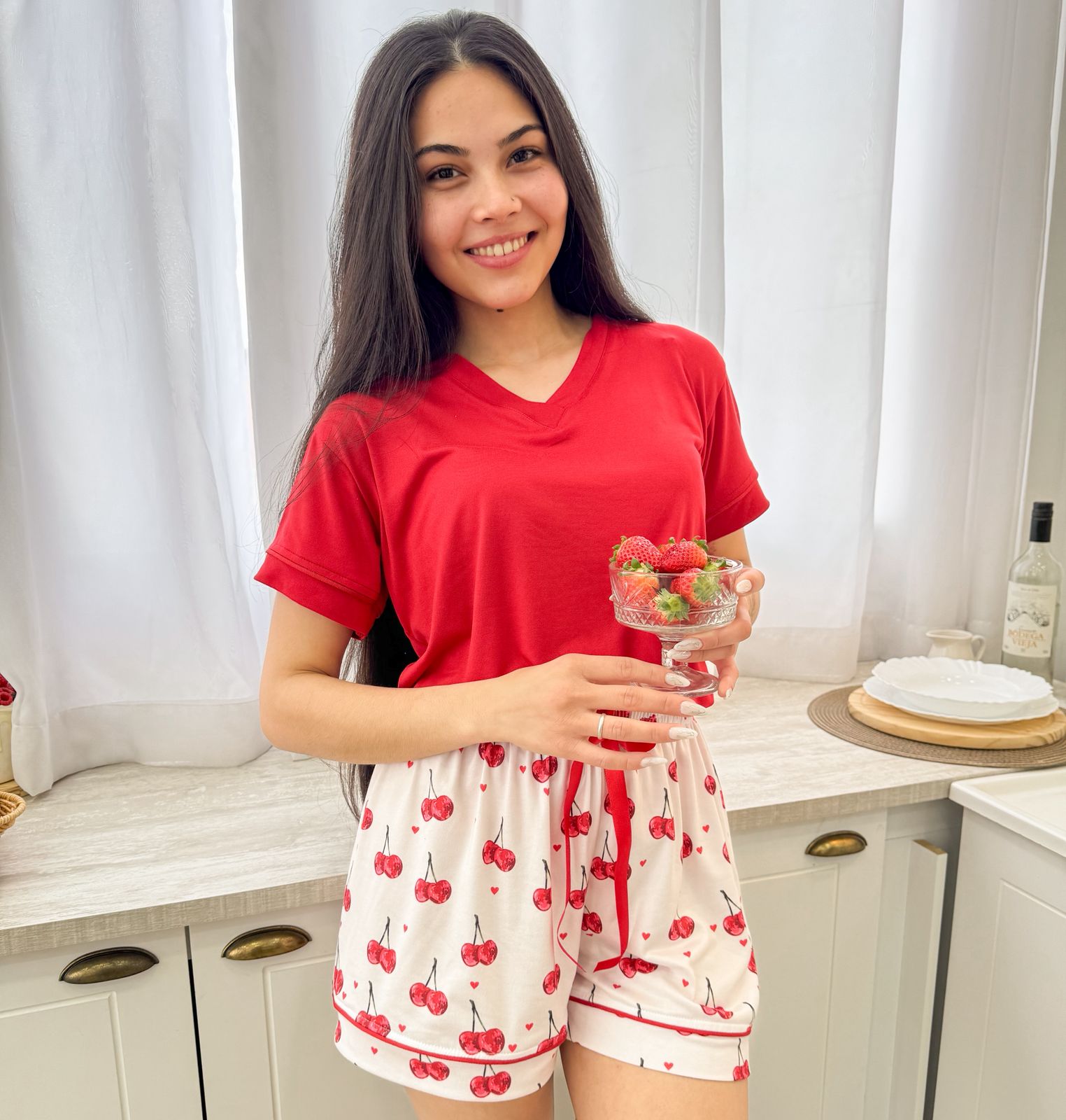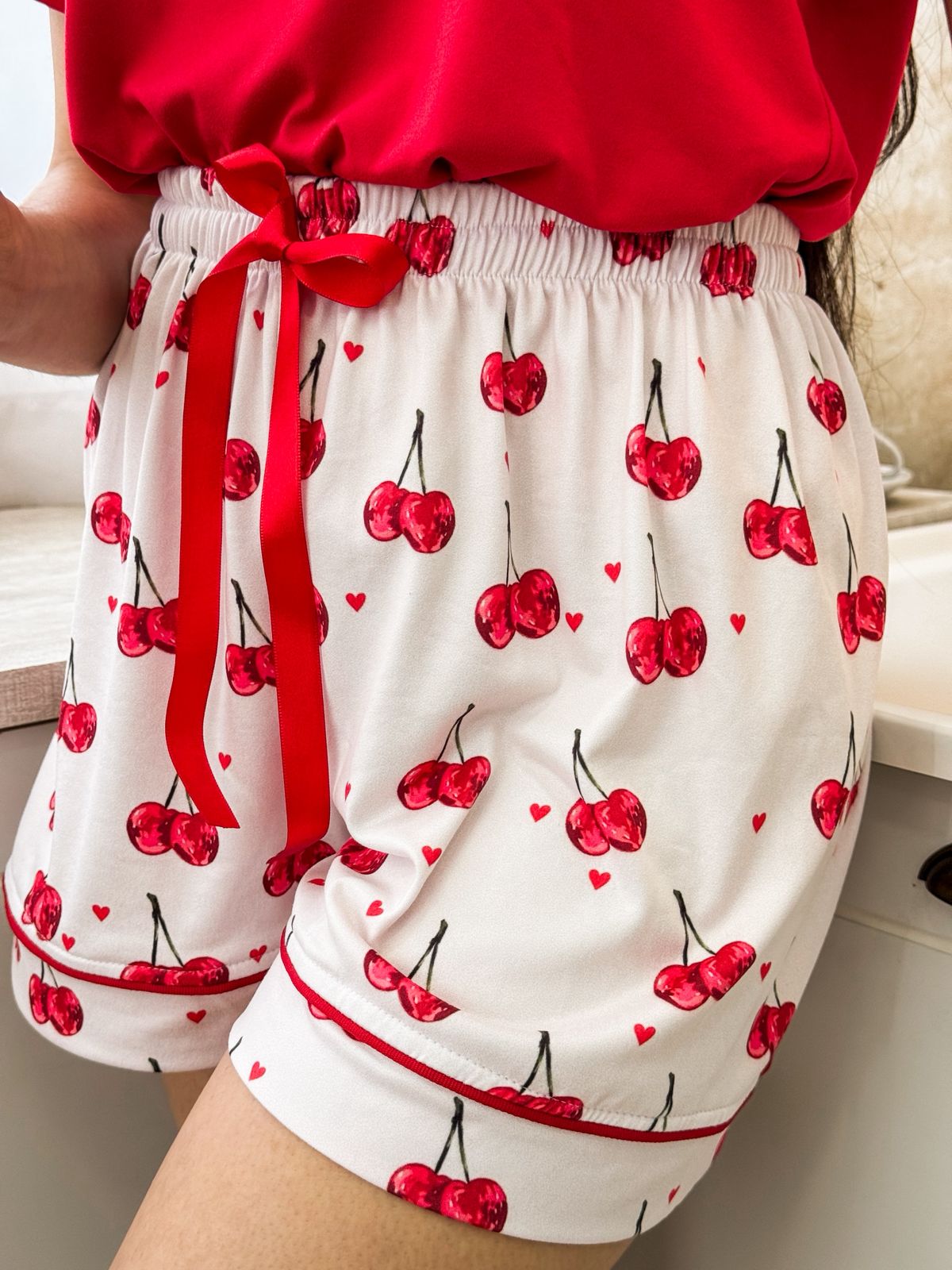 A bermuda é estampada com cerejas, trend do momento, que adiciona charme e diversão ao visual, enquanto a fita decorativa em cetim vermelho completa o acabamento com sofisticação.